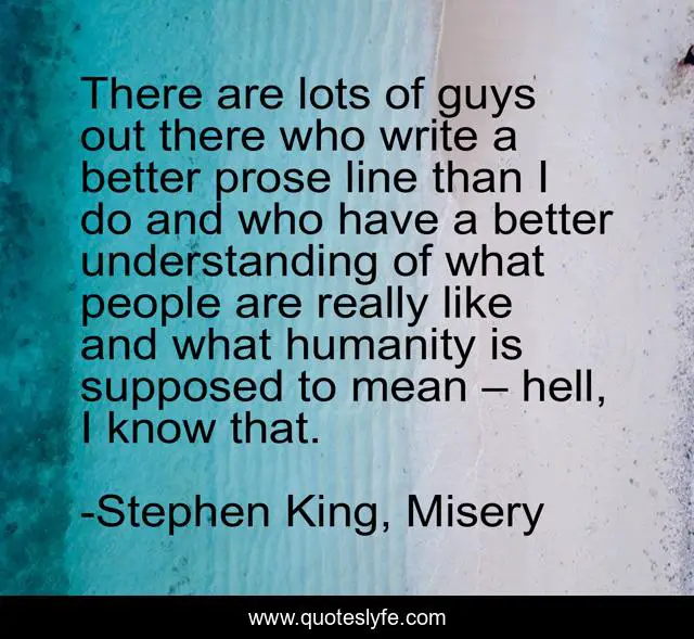 This page presents the quote "There are lots of guys out there who write a better prose line than I do and who have a better understanding of what people are really like and what humanity is supposed to mean – hell, I know that.". Author of this quote is Stephen King, Misery. This quote is about writers-on-writing, writing,.