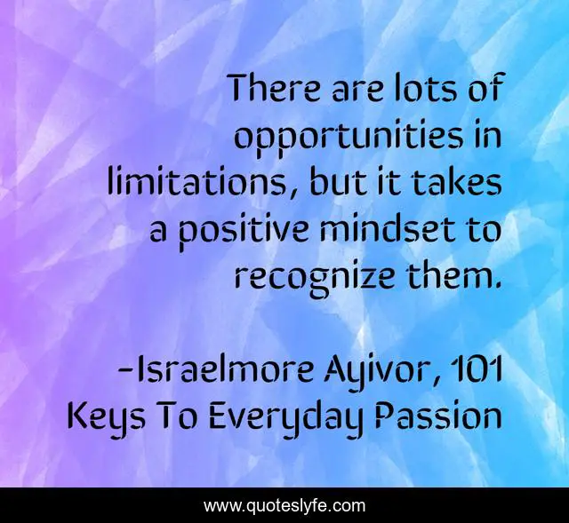 This page presents the quote "There are lots of opportunities in limitations, but it takes a positive mindset to recognize them.". Author of this quote is Israelmore Ayivor, 101 Keys To Everyday Passion. This quote is about limitations, recognitions, limitation, recognize, confidence, opportunities, positive-thinking, behaviour, attitude,.
