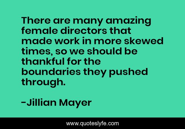 This page presents the quote "There are many amazing female directors that made work in more skewed times, so we should be thankful for the boundaries they pushed through.". Author of this quote is Jillian Mayer. This quote is about amazing, work, be thankful,.