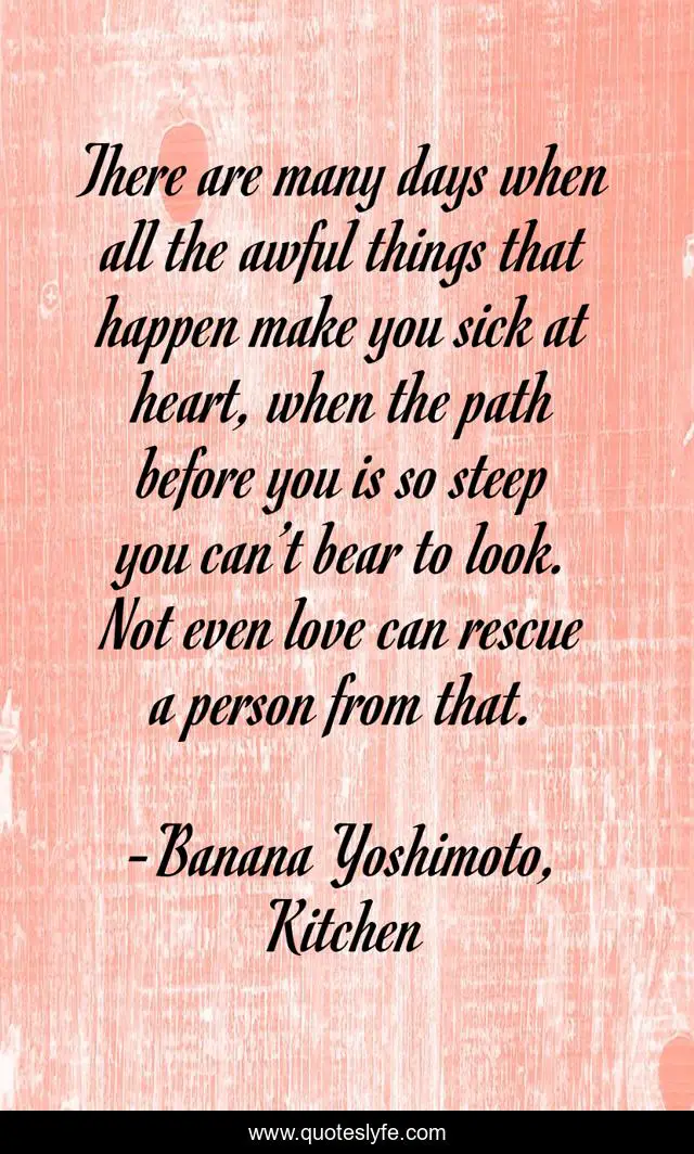 This page presents the quote "There are many days when all the awful things that happen make you sick at heart, when the path before you is so steep you can’t bear to look. Not even love can rescue a person from that.". Author of this quote is Banana Yoshimoto, Kitchen. This quote is about sorrow, heartbreak, love, affection,.