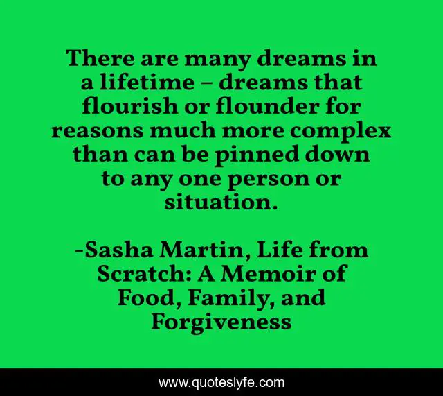 This page presents the quote "There are many dreams in a lifetime – dreams that flourish or flounder for reasons much more complex than can be pinned down to any one person or situation.". Author of this quote is Sasha Martin, Life from Scratch: A Memoir of Food, Family, and Forgiveness. This quote is about life, dreams,.