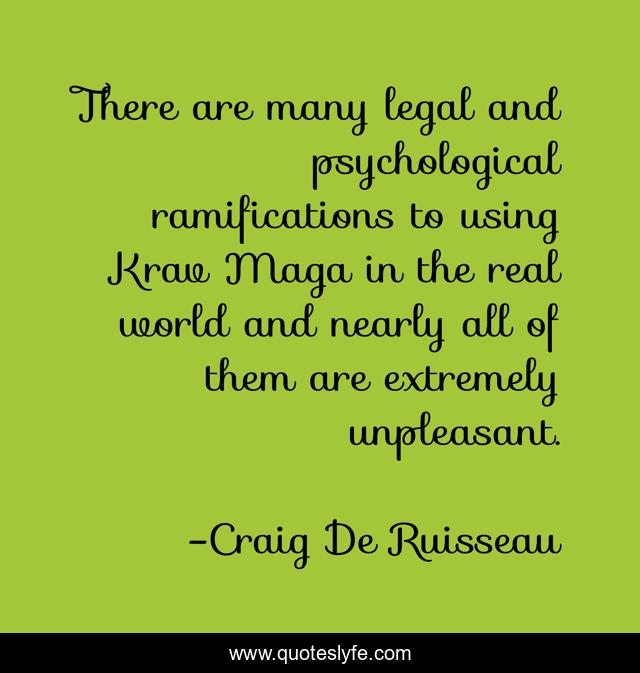 This page presents the quote "There are many legal and psychological ramifications to using Krav Maga in the real world and nearly all of them are extremely unpleasant.". Author of this quote is Craig De Ruisseau. This quote is about psychology, legal, self-defense,.