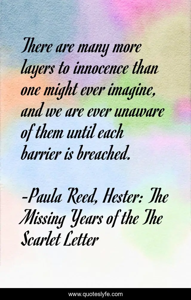 This page presents the quote "There are many more layers to innocence than one might ever imagine, and we are ever unaware of them until each barrier is breached.". Author of this quote is Paula Reed, Hester: The Missing Years of the The Scarlet Letter. .