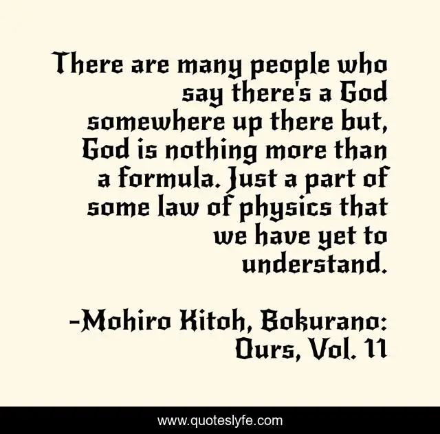 This page presents the quote "There are many people who say there's a God somewhere up there but, God is nothing more than a formula. Just a part of some law of physics that we have yet to understand.". Author of this quote is Mohiro Kitoh, Bokurano: Ours, Vol. 11. This quote is about science, religion, physics, god,.