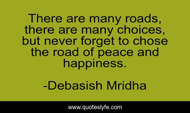 This page presents the quote "There are many roads, there are many choices, but never forget to chose the road of peace and happiness.". Author of this quote is Debasish Mridha. This quote is about life, love, knowledge, inspirational, intelligence, philosophy, wisdom, quotes, affection,.