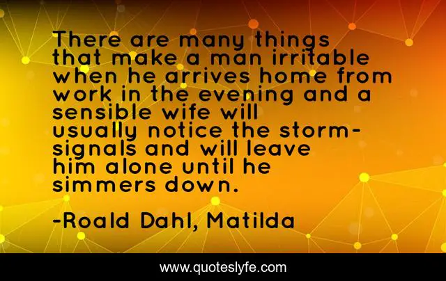 This page presents the quote "There are many things that make a man irritable when he arrives home from work in the evening and a sensible wife will usually notice the storm-signals and will leave him alone until he simmers down.". Author of this quote is Roald Dahl, Matilda. This quote is about work, men,.