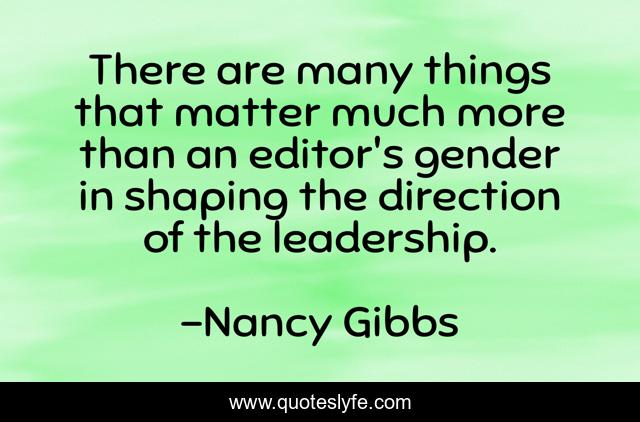 This page presents the quote "There are many things that matter much more than an editor's gender in shaping the direction of the leadership.". Author of this quote is Nancy Gibbs. This quote is about gender, direction, matter,.