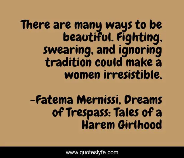 This page presents the quote "There are many ways to be beautiful. Fighting, swearing, and ignoring tradition could make a women irresistible.". Author of this quote is Fatema Mernissi, Dreams of Trespass: Tales of a Harem Girlhood. This quote is about moroccan-literature, rebellion, beauty, feminism, women,.