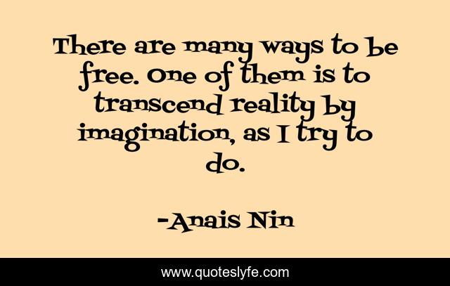 This page presents the quote "There are many ways to be free. One of them is to transcend reality by imagination, as I try to do.". Author of this quote is Anais Nin. This quote is about try, free, reality,.