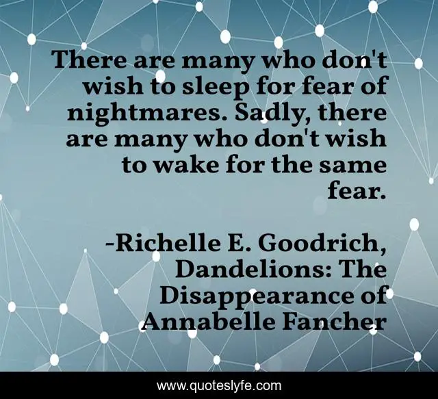 This page presents the quote "There are many who don't wish to sleep for fear of nightmares. Sadly, there are many who don't wish to wake for the same fear.". Author of this quote is Richelle E. Goodrich, Dandelions: The Disappearance of Annabelle Fancher. This quote is about hardship, trials, nightmares, suffering, abuse, richelle, richelle-goodrich, fear,.