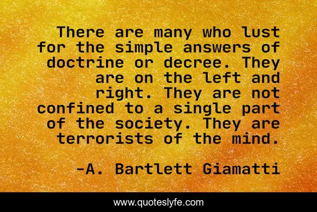 This page presents the quote "There are many who lust for the simple answers of doctrine or decree. They are on the left and right. They are not confined to a single part of the society. They are terrorists of the mind.". Author of this quote is A. Bartlett Giamatti. This quote is about simple, single, mind,.