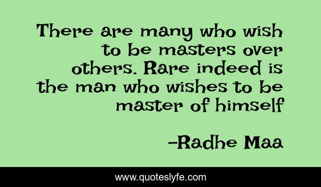 This page presents the quote "There are many who wish to be masters over others. Rare indeed is the man who wishes to be master of himself". Author of this quote is Radhe Maa. This quote is about spiritual, radhe-guru-maa, spiritual-leader, radhe-maa, spiritual-sayings, wisdom, quotes-and-saying, inner-peace, spiritual-insights,.