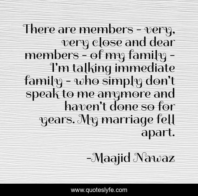 This page presents the quote "There are members - very, very close and dear members - of my family - I'm talking immediate family - who simply don't speak to me anymore and haven't done so for years. My marriage fell apart.". Author of this quote is Maajid Nawaz. This quote is about me, family, speak,.