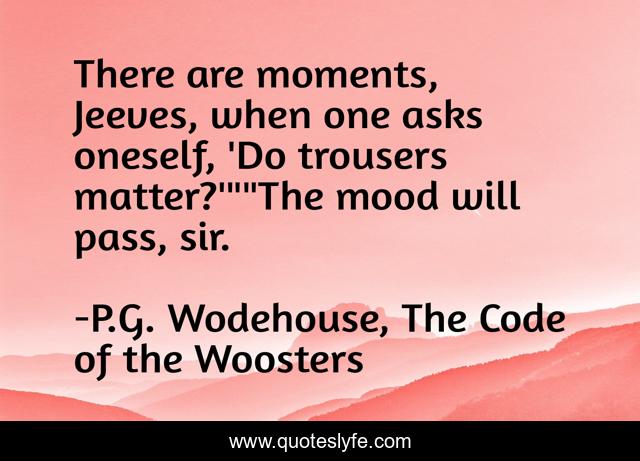 This page presents the quote "There are moments, Jeeves, when one asks oneself, 'Do trousers matter?'""The mood will pass, sir.". Author of this quote is P.G. Wodehouse, The Code of the Woosters. This quote is about appearance, bad-mood, humor, dejection, clothes,.