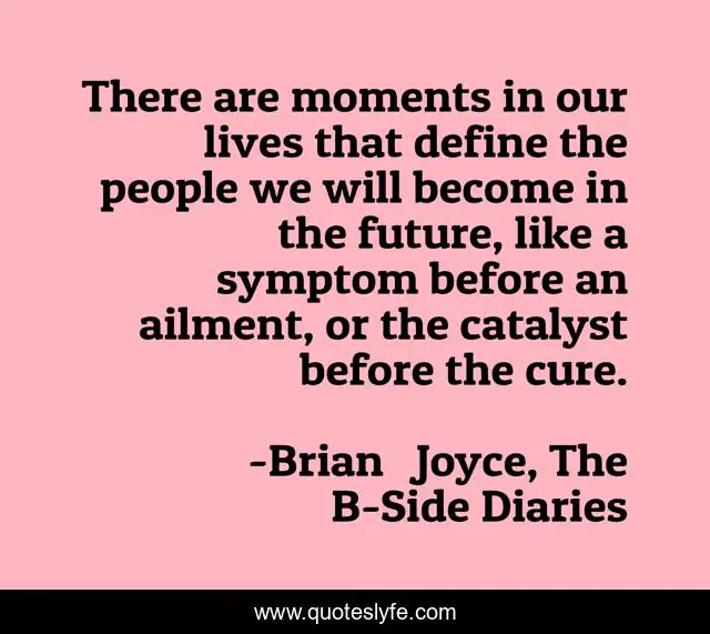 This page presents the quote "There are moments in our lives that define the people we will become in the future, like a symptom before an ailment, or the catalyst before the cure.". Author of this quote is Brian Joyce, The B-Side Diaries. This quote is about contemporary-fiction, young-adult-fiction, indie-music, death-and-dying, punk-rock,.