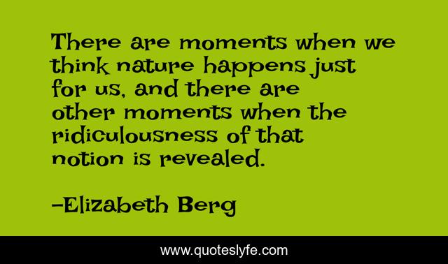 This page presents the quote "There are moments when we think nature happens just for us, and there are other moments when the ridiculousness of that notion is revealed.". Author of this quote is Elizabeth Berg. .
