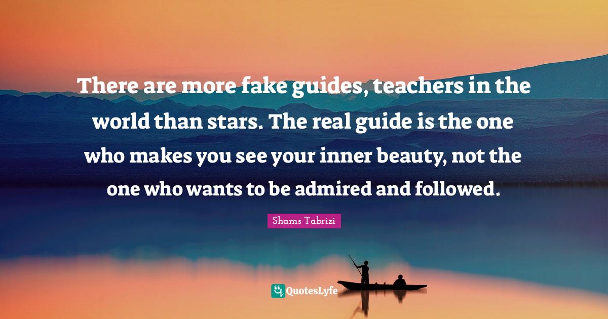 This page presents the quote "There are more fake guides, teachers in the world than stars. The real guide is the one who makes you see your inner beauty, not the one who wants to be admired and followed.". Author of this quote is Shams Tabrizi. This quote is about world, fake, teacher, real, guides, stars, inner beauty,.