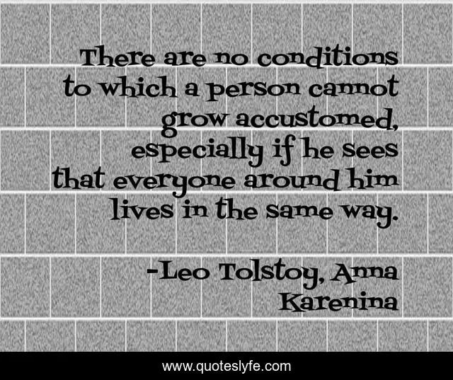 This page presents the quote "There are no conditions to which a person cannot grow accustomed, especially if he sees that everyone around him lives in the same way.". Author of this quote is Leo Tolstoy, Anna Karenina. This quote is about life, conditions,.