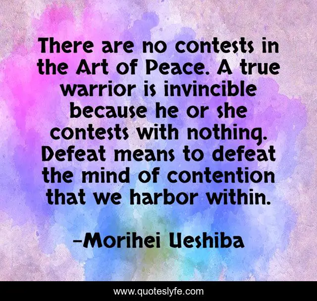 This page presents the quote "There are no contests in the Art of Peace. A true warrior is invincible because he or she contests with nothing. Defeat means to defeat the mind of contention that we harbor within.". Author of this quote is Morihei Ueshiba. This quote is about warrior, peace, mind,.