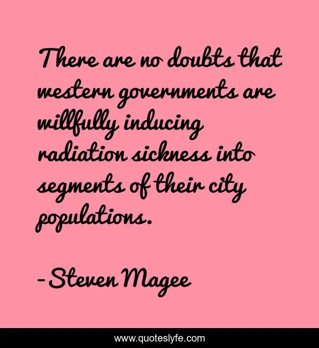This page presents the quote "There are no doubts that western governments are willfully inducing radiation sickness into segments of their city populations.". Author of this quote is Steven Magee. This quote is about illness, inducing, into, city, no, west, segments, populations, radiation,.