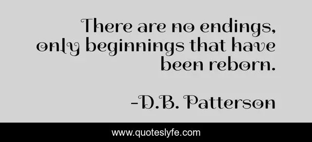 This page presents the quote "There are no endings, only beginnings that have been reborn.". Author of this quote is D.B. Patterson. This quote is about chinese-proverb, wisdom, philosophical, inspirational, enthusiasm, mythology,.
