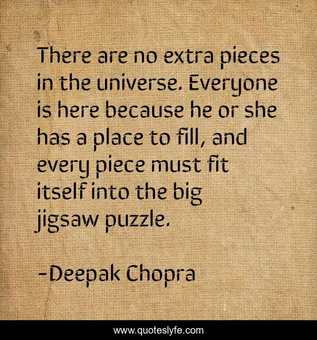 This page presents the quote "There are no extra pieces in the universe. Everyone is here because he or she has a place to fill, and every piece must fit itself into the big jigsaw puzzle.". Author of this quote is Deepak Chopra. This quote is about knowing-oneself, universe, finding-your-place, life-purpose,.
