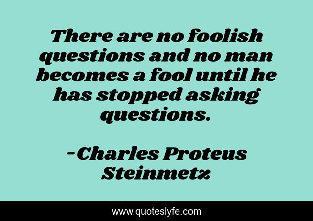 This page presents the quote "There are no foolish questions and no man becomes a fool until he has stopped asking questions.". Author of this quote is Charles Proteus Steinmetz. This quote is about fool, science, advice, foolish, questions,.