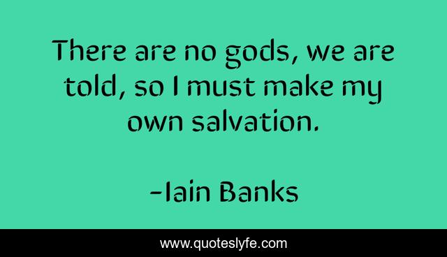 This page presents the quote "There are no gods, we are told, so I must make my own salvation.". Author of this quote is Iain Banks. This quote is about gods, salvation, inspirational, enthusiasm,.