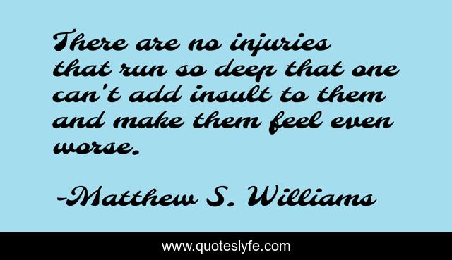 This page presents the quote "There are no injuries that run so deep that one can't add insult to them and make them feel even worse.". Author of this quote is Matthew S. Williams. This quote is about pain, trauma, injuries, insult,.