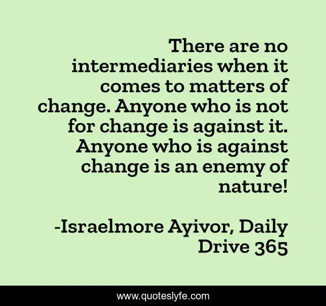 This page presents the quote "There are no intermediaries when it comes to matters of change. Anyone who is not for change is against it. Anyone who is against change is an enemy of nature!". Author of this quote is Israelmore Ayivor, Daily Drive 365. This quote is about make-a-change, enemy, food-for-thought, change-we-need, israelmore-ayivor, nature, change-your-life, middle, excellence,.