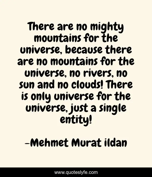 This page presents the quote "There are no mighty mountains for the universe, because there are no mountains for the universe, no rivers, no sun and no clouds! There is only universe for the universe, just a single entity!". Author of this quote is Mehmet Murat ildan. This quote is about mountain, river, clouds, mountains, single-entity, rivers, universe, sun, cosmos,.