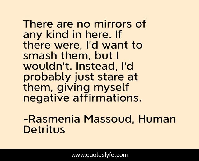 This page presents the quote "There are no mirrors of any kind in here. If there were, I’d want to smash them, but I wouldn’t. Instead, I’d probably just stare at them, giving myself negative affirmations.". Author of this quote is Rasmenia Massoud, Human Detritus. This quote is about affirmations, mirrors, humor, self-esteem,.