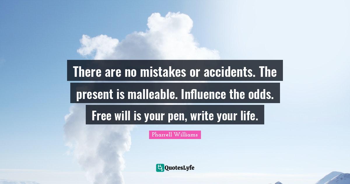 This page presents the quote "There are no mistakes or accidents. The present is malleable. Influence the odds. Free will is your pen, write your life.". Author of this quote is Pharrell Williams. This quote is about writing, accidents, free will, life, mistake, influence, odds,.