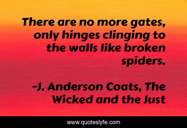 This page presents the quote "There are no more gates, only hinges clinging to the walls like broken spiders.". Author of this quote is J. Anderson Coats, The Wicked and the Just. This quote is about ya, wales, young-adult-fiction, historical, the-wicked-and-the-just,.
