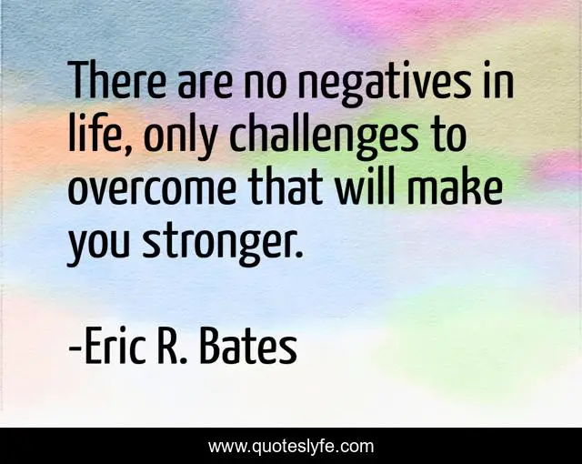 This page presents the quote "There are no negatives in life, only challenges to overcome that will make you stronger.". Author of this quote is Eric R. Bates. This quote is about challenges, overcoming-challenges,.