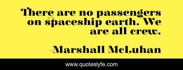 This page presents the quote "There are no passengers on spaceship earth. We are all crew.". Author of this quote is Marshall McLuhan. This quote is about earth, spaceship, passengers,.