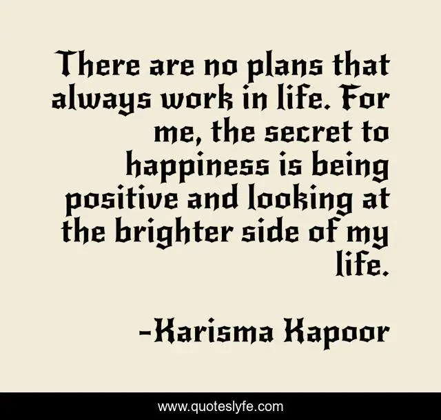 This page presents the quote "There are no plans that always work in life. For me, the secret to happiness is being positive and looking at the brighter side of my life.". Author of this quote is Karisma Kapoor. This quote is about positive, life, work, confidence,.