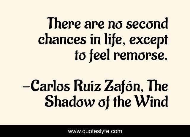 This page presents the quote "There are no second chances in life, except to feel remorse.". Author of this quote is Carlos Ruiz Zafón, The Shadow of the Wind. This quote is about life, second-chances,.