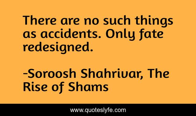 This page presents the quote "There are no such things as accidents. Only fate redesigned.". Author of this quote is Soroosh Shahrivar, The Rise of Shams. This quote is about the-rise-of-shams, accidents, fate, fate-destiny, inspirational, mysticism, enthusiasm, esoteric-wisdom,.