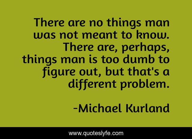 This page presents the quote "There are no things man was not meant to know. There are, perhaps, things man is too dumb to figure out, but that's a different problem.". Author of this quote is Michael Kurland. This quote is about science, forbidden-knowledge, humor, logic,.