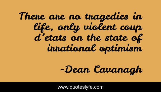 This page presents the quote "There are no tragedies in life, only violent coup d’etats on the state of irrational optimism". Author of this quote is Dean Cavanagh. This quote is about dean-cavanagh, life, tragedy, optimism,.