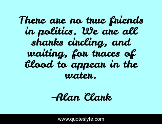 This page presents the quote "There are no true friends in politics. We are all sharks circling, and waiting, for traces of blood to appear in the water.". Author of this quote is Alan Clark. This quote is about water, waiting, friends,.
