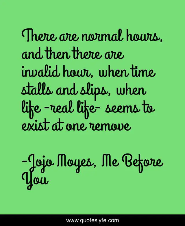 This page presents the quote "There are normal hours, and then there are invalid hour, when time stalls and slips, when life -real life- seems to exist at one remove". Author of this quote is Jojo Moyes, Me Before You. This quote is about beautiful-writing, deep,.