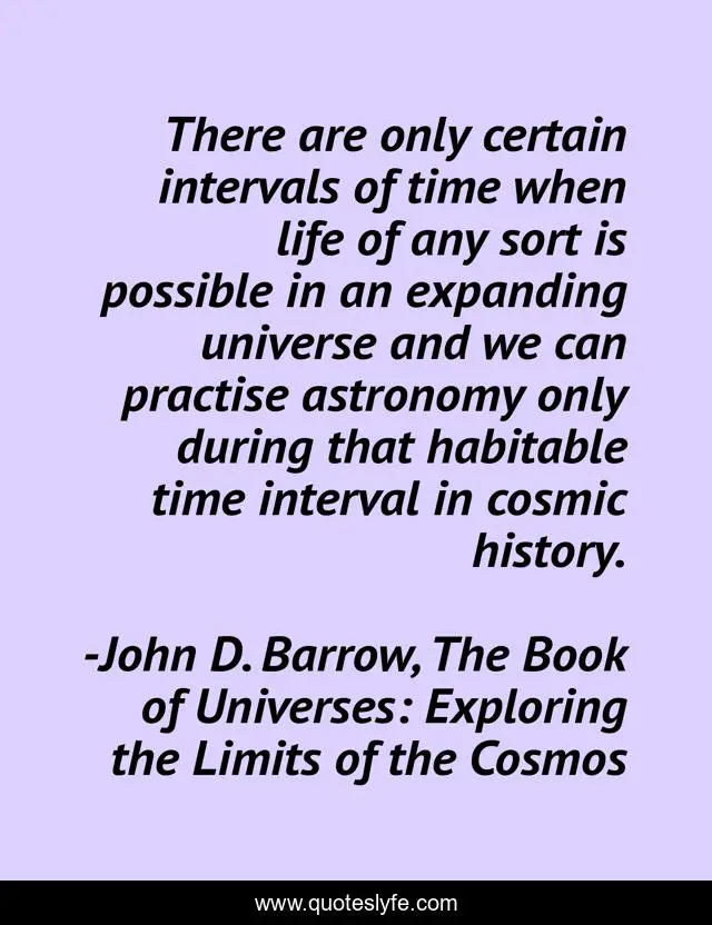 This page presents the quote "There are only certain intervals of time when life of any sort is possible in an expanding universe and we can practise astronomy only during that habitable time interval in cosmic history.". Author of this quote is John D. Barrow, The Book of Universes: Exploring the Limits of the Cosmos. This quote is about universe, life, cosmology, time,.