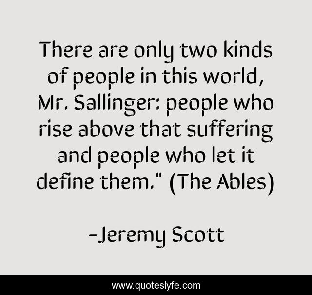 This page presents the quote "There are only two kinds of people in this world, Mr. Sallinger: people who rise above that suffering and people who let it define them." (The Ables)". Author of this quote is Jeremy Scott. This quote is about jeremy-scott, suffering, the-ables, overcome, people,.