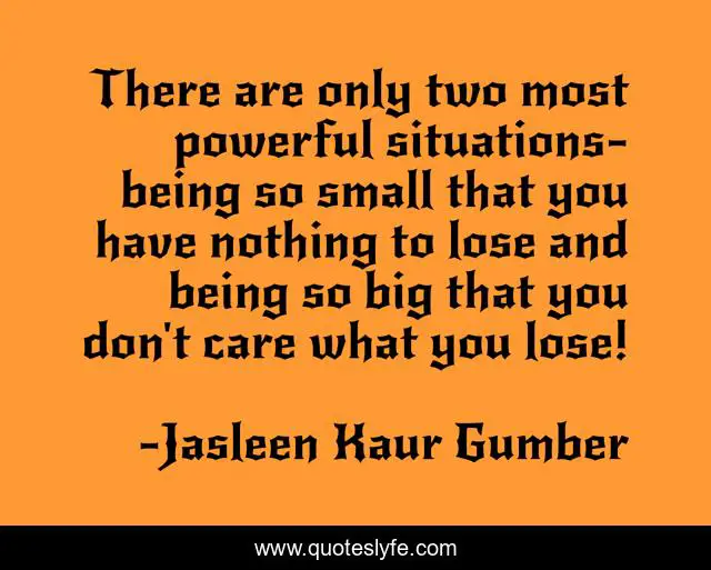 This page presents the quote "There are only two most powerful situations- being so small that you have nothing to lose and being so big that you don't care what you lose!". Author of this quote is Jasleen Kaur Gumber. This quote is about loss, life, psychology, power, power-of-thoughts, philosophy, powerful, loss-of-faith, life-lessons,.