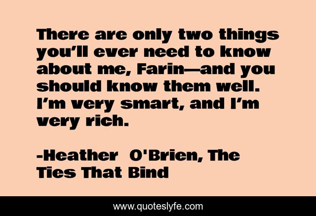 This page presents the quote "There are only two things you’ll ever need to know about me, Farin—and you should know them well. I’m very smart, and I’m very rich.". Author of this quote is Heather O'Brien, The Ties That Bind. This quote is about fictional-characters, series-debut, fiction-novel, fiction, suspense-and-drama, suspense, family-drama, celebrity-culture,.
