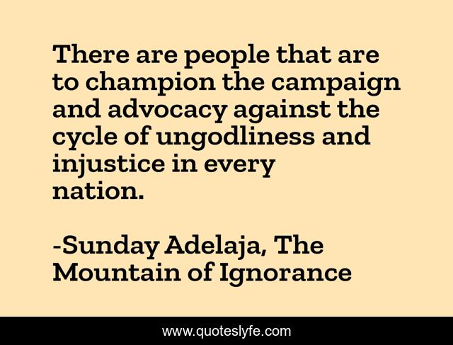 This page presents the quote "There are people that are to champion the campaign and advocacy against the cycle of ungodliness and injustice in every nation.". Author of this quote is Sunday Adelaja, The Mountain of Ignorance. This quote is about mountain, life, champion, campaign, danger, god, people, ignorance, advocacy,.