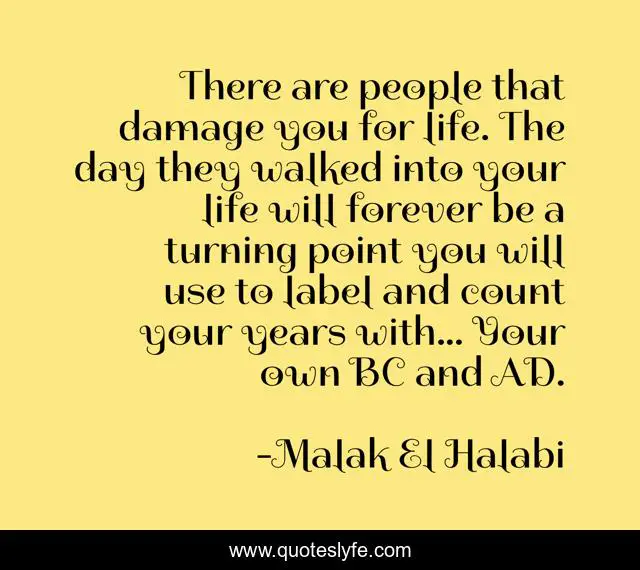 This page presents the quote "There are people that damage you for life. The day they walked into your life will forever be a turning point you will use to label and count your years with... Your own BC and AD.". Author of this quote is Malak El Halabi. This quote is about turning-point, pain, ad, people, abuse-survivors, damage, bc, hurt, abuse,.