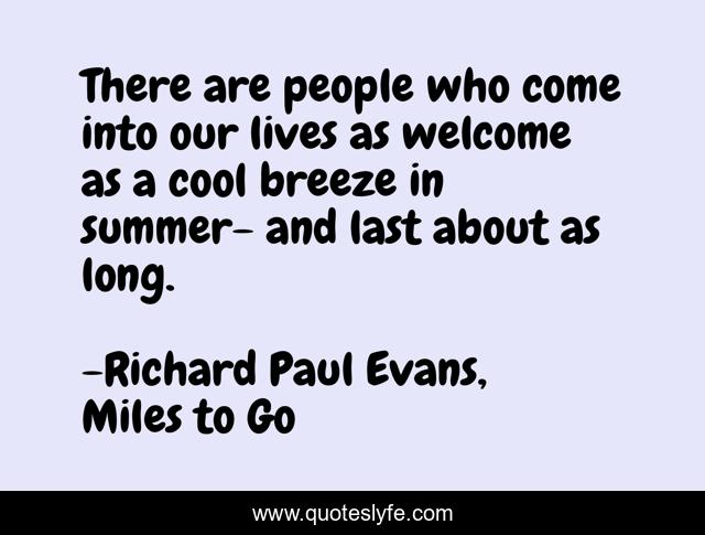 This page presents the quote "There are people who come into our lives as welcome as a cool breeze in summer- and last about as long.". Author of this quote is Richard Paul Evans, Miles to Go. .